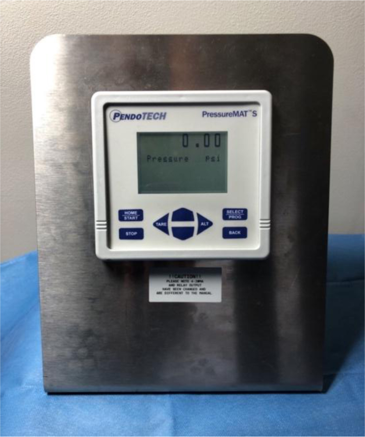 A PendoTECH pressure sensor and PendoTech PressureMATTMS were purchased from the United States (PendoTECH, Princeton, New Jersey). These two electronic items are designed to be used in conjunction with each other. The pressure sensor is connected simultaneously to the PendoTECH PressureMATTMS, and in-line with the syringe and PNB needle extension tubing. The MATTMS functions as a pressure monitor, high-pressure alarm, and a transmitter [22]. According to the manufacturer’s website, the portable, lightweight monitor does not need calibration or maintenance [22]. The PressureMATTMS has a digital display where the process pressure can be read in either kPa or psi. There is a button to zero tare to atmospheric pressure prior to each measurement. Fig. (3) shows a PendoTECH PressureMATTMS displaying a pressure measurement in psi.